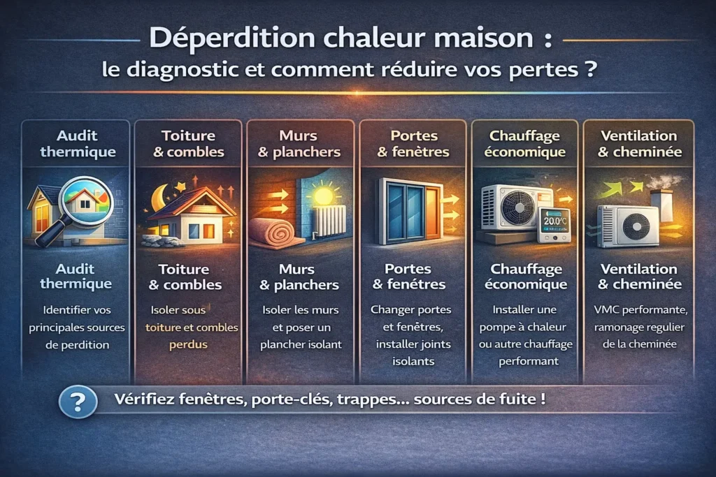 En regardant la maison comme une coupe, on voit vite les parts, typiquement environ 20% par les murs, 20% par les fuites et renouvellement d’air via conduits de cheminée, hotte, gaines, etc, 15% par les menuiseries si fenêtres classiques en simple vitrage, et 10% par les planchers bas. Ces chiffres donnent de l’ordre, pas une vérité gravée dans le marbre. Suivant l’âge de la maison, la qualité des vitrages, et la ventilation, les pourcentages bougent. Astuce, commencer par les plus gros postes, murs et air, puis affiner avec thermographie. On gagne en confort et on voit vite l’économie réalisée. sincèrement.
