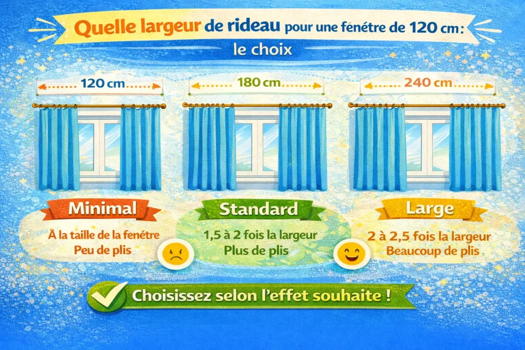 - Tringle recommandée : on prévoit 150–160 cm pour une fenêtre de 120 cm afin de dégager l’encadrement et la lumière sans gâcher la vitre.